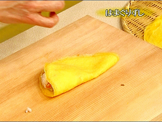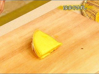 (2)薄焼き卵の上にのせる(薄くしたところを内側におく)。