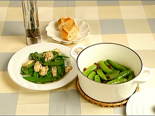 絹さやとモッツァレラのアンチョビー炒め スナップえんどうとレーズンのバター蒸し