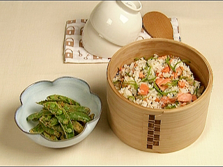 絹さやと塩鮭のごはん スナップえんどうのきな粉あえ