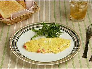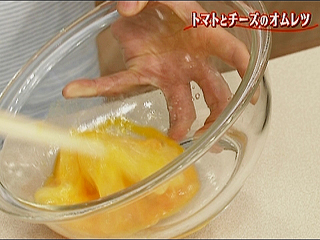 (2)フライパンを火にかけ、バターを溶かし、バターがパチパチしてきたら卵液を一気に流す。