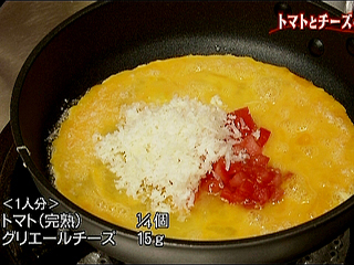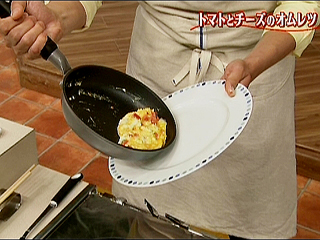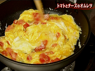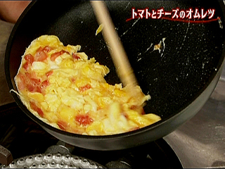 (5)半熟になったら、いったん全体を広げてからフライパンの奥に卵を寄せる。