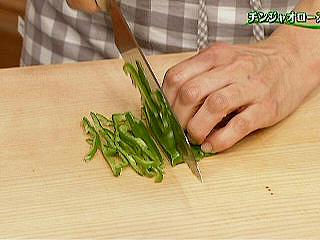 (2)縦にせん切り(火の通りが均一になるように太さを揃える)。
