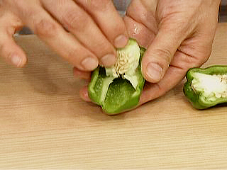 (1)軽くおしつぶして縦半分に切って、種と白いワタを取り除く。