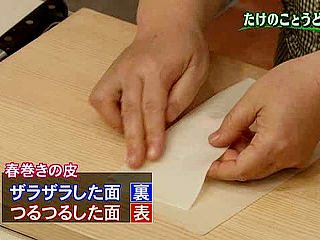春巻きの皮の裏表に注意!!触ってみてツルツルっとした面が表、 ザラザラしているほうが裏です(揚げ上がったときによくわかる)。