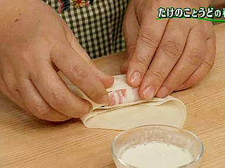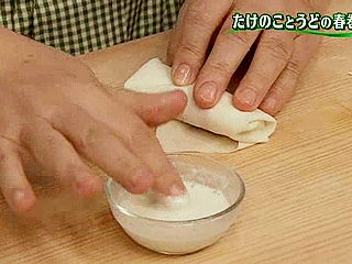 (4)巻き終わりは小麦粉のりをぬって留める。