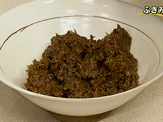 材料:つくりやすい分量 ふきのとう・・・100g(12個) みそ・・・50g 砂糖・・・大さじ2 しょうゆ・・・大さじ2 酒・・・大さじ2 作り方 (1)ふきのとうは1分ほどゆで、水にとり30分ほどさらしてアク抜きをします。 (2)(1)の水気を絞って、庖丁で細かく刻みます。 (3)鍋にみそ、砂糖、しょうゆ、酒を入れて混ぜ、(2)も加えて火にかけ、汁気がなくなるまで炒りつけます。 メモ:保存びんなどに入れ、冷蔵庫で10日は保存可能。