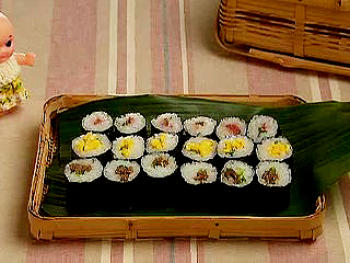 (2)巻きすにのりをのせ、すしめしをのりの奥1cm残して広げる(向こう側は薄めに広げる)。