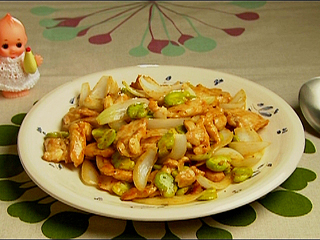 そら豆と玉ねぎを炒めるときも同様に炒める前にからめてコーティングをしておくこと(フライパンも冷ましておく)。