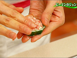 肉だねがはずれないように、ピーマンの内側に小麦粉をふってから肉だねを詰める。