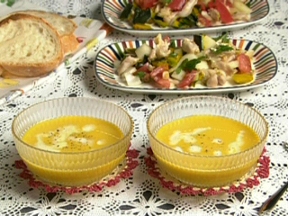 鶏手羽元でスープをとり、残った鶏肉とかぼちゃの皮はサラダに使います