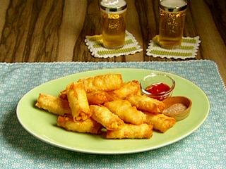 皮がそり返らないように、巻き終わりを下にして揚げます。