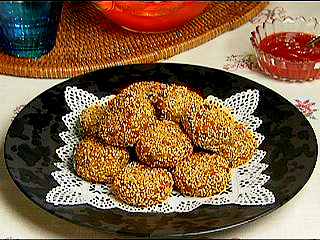 たねがやわらかいので、白ごまをつけならが成形するとよい。
