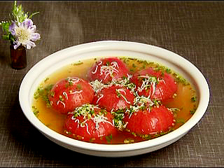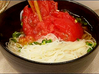 ゆでたそうめんと一緒に、トマトをくずして絡めながら・・・ 冷たくしてもおいしい。