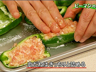肉だねがピーマンからはずれないように、片栗粉をふってから詰める。