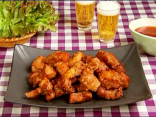 片栗粉を肉に手でよくもみ込んで、全量をなじませてから揚げます。