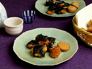 のりは噛み切りにくいので、鶏肉は小さく切って、のりを上下にサンドするのがおいしさのヒミツ。