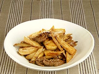 根菜は水気をよくふき、表面がチリチリになるまでじっくり炒めます。
