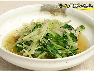 材料:4人分 根三つ葉・・・1わ(150g) だし汁・・・1/4カップ しょうゆ・・・小さじ1/2 塩・・・小さじ1/4 炒り白ごま・・・小さじ1 作り方 (1)根三つ葉は熱湯でさっとゆでて、水気を絞り4~5cm長さに切っておく。 (2)ボールにだし汁、調味料、白ごまを混ぜ、(1)の水気を絞って加えてあえる。