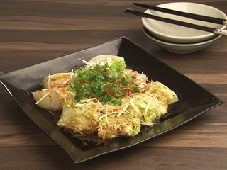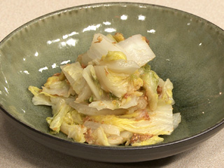 蒸し白菜2~3枚をざく切りにして粗塩少々をしておく。ボールに白すりごま(小さじ2)、みそ(小さじ2)、しょうが汁(少々)を加えて混ぜ、白菜の水気を絞ってあえる。