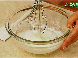 卵白はボールを逆さまにしても落ちてこない位、しっかり泡立てること。