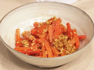 材料:4人分 にんじん・・・1本(150g) 松の実・・・30g しょうゆ・・・大さじ1 砂糖・・・小さじ1 作り方 (1)松の実は電子レンジ(500W)で2分加熱しておきます。 (2)にんじんは太めのせん切りにし、さっとゆでます。 (3)すり鉢に(1)を入れてすり混ぜ、調味料を加えてさらに混ぜ、(2)を加えてあえます。 器に盛り、あればにんじんの葉を飾ります。
