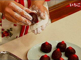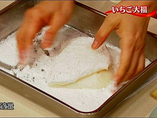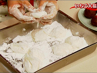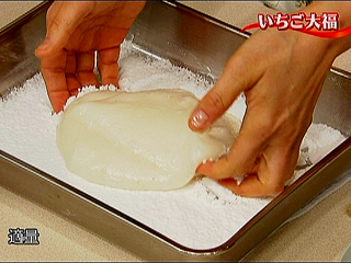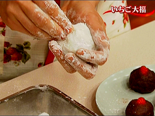 (5)いちごあん玉のいちごの先端が中央になるようにのせて、包む。