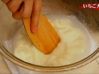 いちごはヘタつきのまま洗い、すぐにペーパーにとって水気を拭いておくこと(水気があるとあんのつきが悪くなる)。