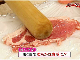 (2)めん棒で叩く(肉の繊維が切れてやわらかい食感に)。