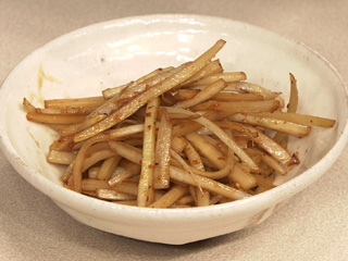強火でさっと焼いて、調味料を加えて照りをつけて仕上げること(火を通しすぎると、うどの歯ごたえがなくなってしまう)。