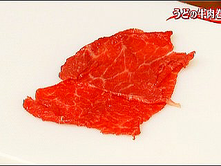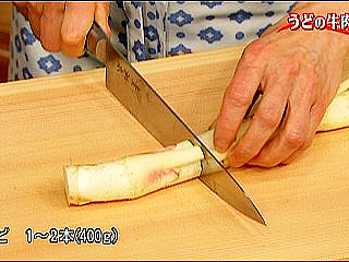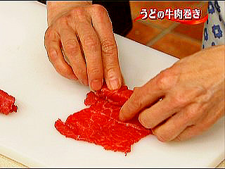 (2)うどは牛肉の幅に合わせて切る。