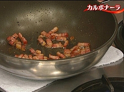 (1)ベーコンを炒め脂が出てきたら、火からおろして温度を下げておく。