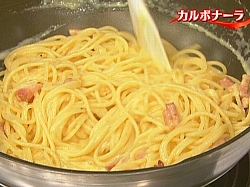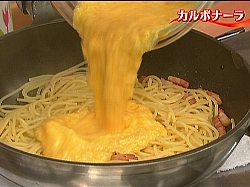 (2)ゆで上がったパスタを加えてあえ、卵ソースを加える。
