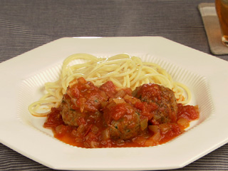 ミートボールは表面だけを焼きつけてとりだしておくこと(トマトが煮詰まってからもどす)。