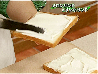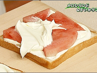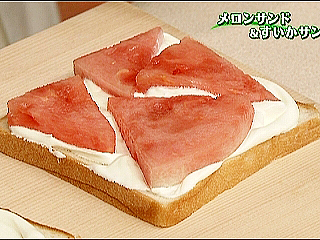 (2)片方のパンにすいか(メロン)を汁気をきって、隙間なく並べる(四隅もしっかりと)。