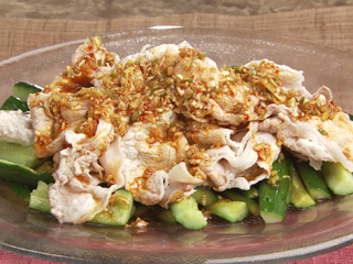 ゆでた豚肉は水にとって冷まし、すぐにザルに上げてラップをかけておくこと(水に長くつけないこと)。