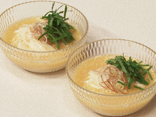 材料:4人分 だし汁・・・2カップ 炒り白ごま・・・大さじ2 みそ・・・大さじ2 そうめん(ゆでたもの)・・・1わ分 みょうが・・・2個 青じそ・・・10枚 作り方 (1)ごまをフライパンで軽く炒った後、すり鉢に入れてすり、みそを加えてさらにすり、なじんだら冷たいだし汁を少しずつ加えてのばす。 (2)器にそうめんを盛り、(1)をかけ、刻んだみょうがと青じそをのせる。