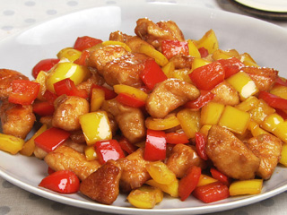 鶏肉は下味をまぶして、焼きつける直前に片栗粉をまぶし、完全に火を通しておくこと。
