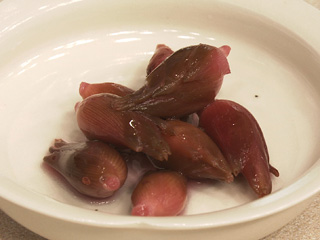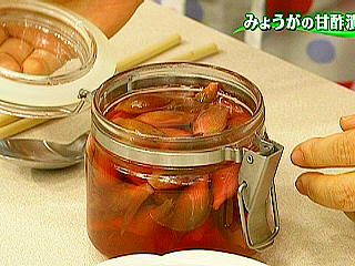 材料 みょうが・・・20個(200g) 甘酢(酢1カップ、砂糖1/2カップ、塩大さじ1/2、水1カップ) 作り方 (1)みょうがは縦半分に切って、ボールに入れる。 (2)鍋に甘酢の調味料と水を加えて煮立て、(1)のみょうがにかける。