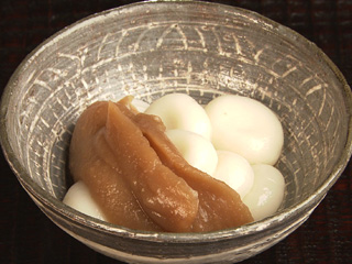 ゆで上がった白玉は水にとってからシロップに浸すのがポイント、こうすることで水っぽくなりません。