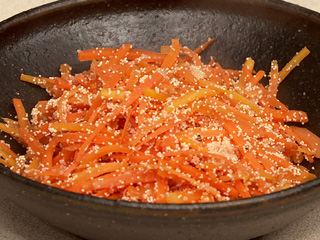 材料: にんじん・・・1/2本(100g) たらこ・・・1/2腹(40g) 酒・・・大さじ1 しょうゆ・・・少々 作り方 (1)にんじんは2cm長さの細切り、たらこは薄皮をのぞいてほぐす。 (2)フライパンににんじんと酒を入れて中火で炒りつけます (3)しんなりしたら、たらこを混ぜ、仕上げにしょうゆを落とします。