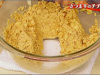 さつま芋は種類や時期によって水分に差があるので、水を加減して加え、まとめられる固さにする。水を入れすぎてしまったときは片栗粉を足すとよい。