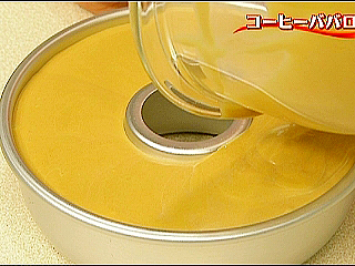 (1)ババロア液のとろみと泡立てた生クリームのとろみ加減を同じくらいにしてから混ぜ合わせる(こうするとキレイに均一に混ぜられる)。 (2)型一杯まで流し入れ、生地が余った場合は、グラスなどに入れて別に冷やし固める。
