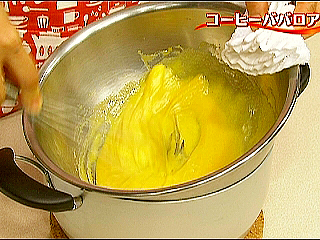 卵黄と砂糖を湯煎にかけながら混ぜるとき、ボールが熱くなるので、 必ず布巾やミトンなどでおさえて作業します。