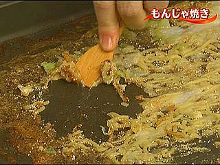 水分を飛ばすように焼き、こんがりした部分を削りながら食べるのが‘もんじゃ’の特徴です。