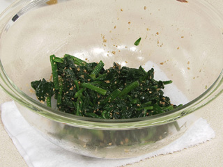 材料: ほうれん草・・・1わ(250g) ごま油・・・小さじ2 塩・・・小さじ1/3 おろしにんにく・・・少々 すり白ごま・・・大さじ1 しょうゆ・・・小さじ1/2 作り方 (1)ほうれん草はゆでて、水気を絞り、3~4cm長さに切る。 (2)ボールに再度水気を絞った(1)、ごま油、白ごま、にんにく、しょうゆを加えてよく混ぜる。
