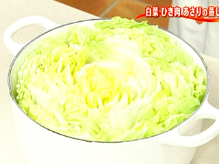 (1)白菜の葉元を中心にして切り口が上になるようにおき、葉先は側面に入れる。
