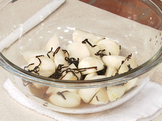 材料: かぶ・・・4個 砂糖、しょうゆ・・・各小さじ1 酢・・・大さじ3 みりん・・・小さじ2 塩昆布・・・10g ・塩 作り方 (1)かぶは縦6~8等分のくし形に切り、水1カップと塩小さじ1を合わせた塩水に15分つけておく。 (2)ボールに調味料を合わせ、(1)の水気を絞って加えてあえる。
