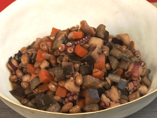 大豆と相性の良いたこをプラスした五目豆、 大豆のサポニンの効果で、たこがやわらかく煮えます。