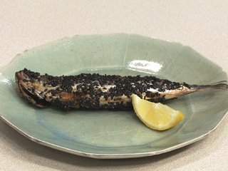 材料:4人分 いわしの丸干し・・・4尾(240g) 衣(小麦粉大さじ1、水大さじ1+1/2) 黒ごま・・・大さじ3 ・油、レモン 作り方 (1)小麦粉に水を加えて混ぜ衣を作る。 (2)いわしに(1)をまわしかけ、黒ごまを表面にまぶす。 (3)フライパンに多めの油で、4~5分かけて揚げ焼きにし(170℃)、器に盛りレモンのくし形切りを添える。