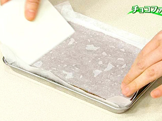 チョコレートとレーズンを合わせたらバットに流し、上からオーブンシートをかぶせて平らにならす。